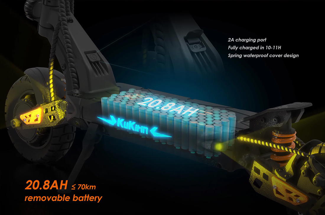 - Батарея: Ємна батарея 52 В 20,8 А/год — дозволяє подолати до 70 км на одному заряді, що забезпечує тривалі поїздки без необхідності частого заряджання.